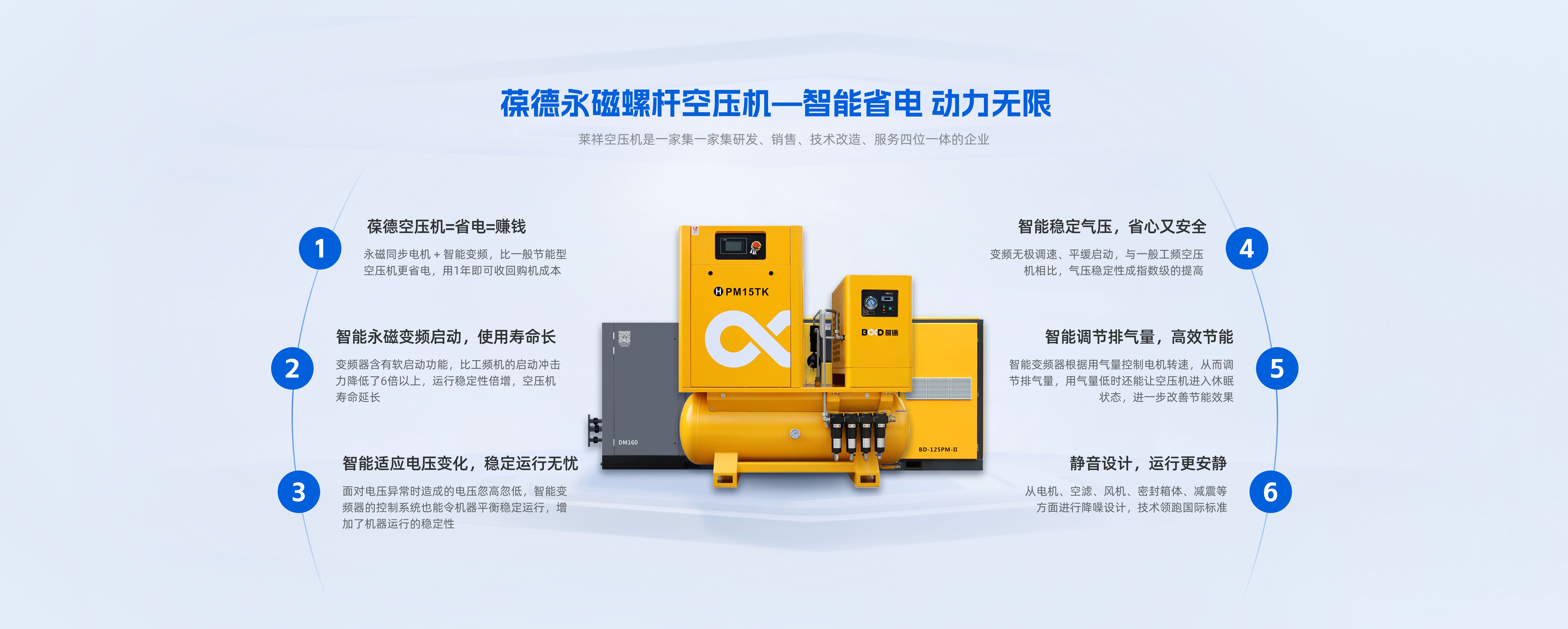 成立于2017年,是一家集研发、销售、技术改造、服务四位一体的高新技术。企业公司秉承“以人为本,诚信,专业,服务”的经营理念,为每位客户提供完善的售前、售中、售后服务,并致力于空压气站工程的设计、安装和机电产品相关配套的研发和运用。 莱祥公司专业的销售服务团队,24小时服务。让客户使用好的空气压缩机,让客户享受价值。