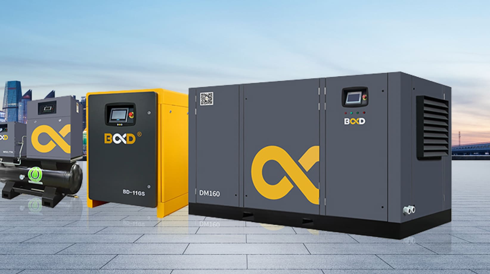 葆德空压机品类包括工频一体轴、智能永磁变频、二级压缩、永磁低压、水润滑无油等系列,功率范围3.7kW到1200kW,压力范围0.6barG至35barG